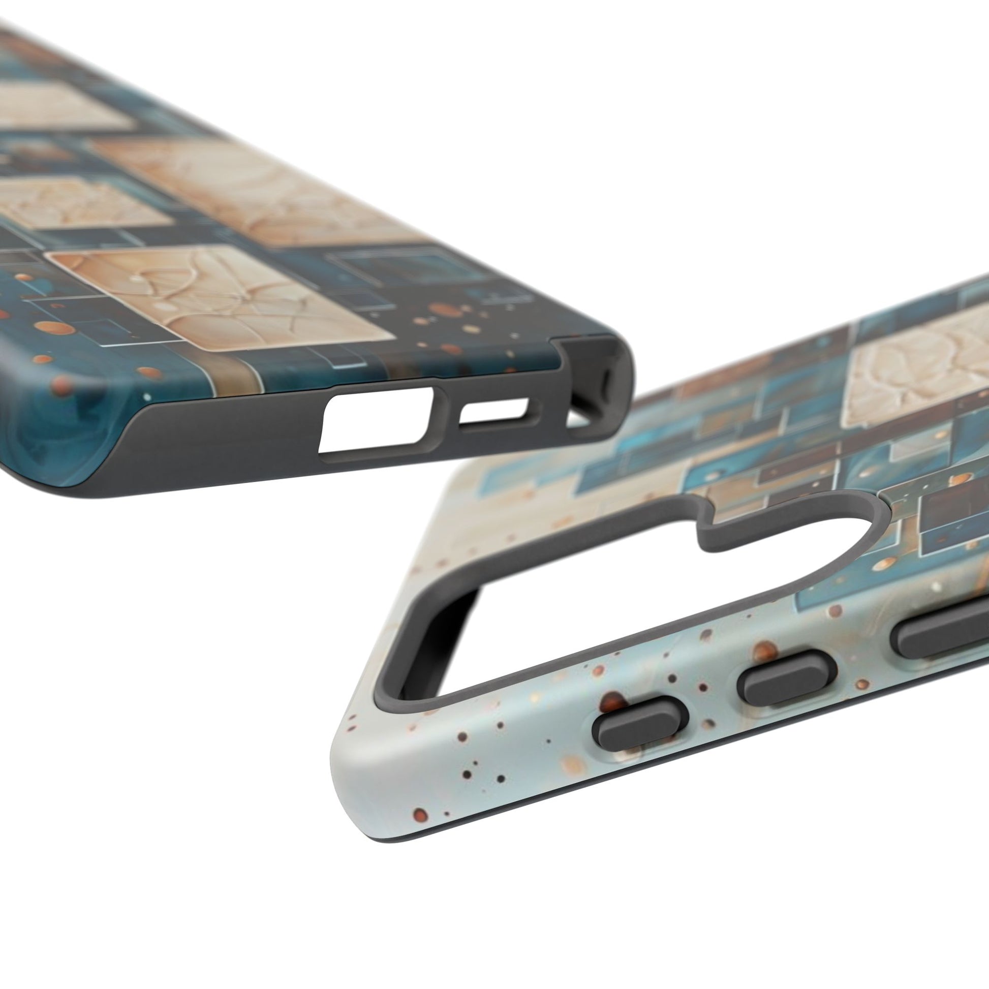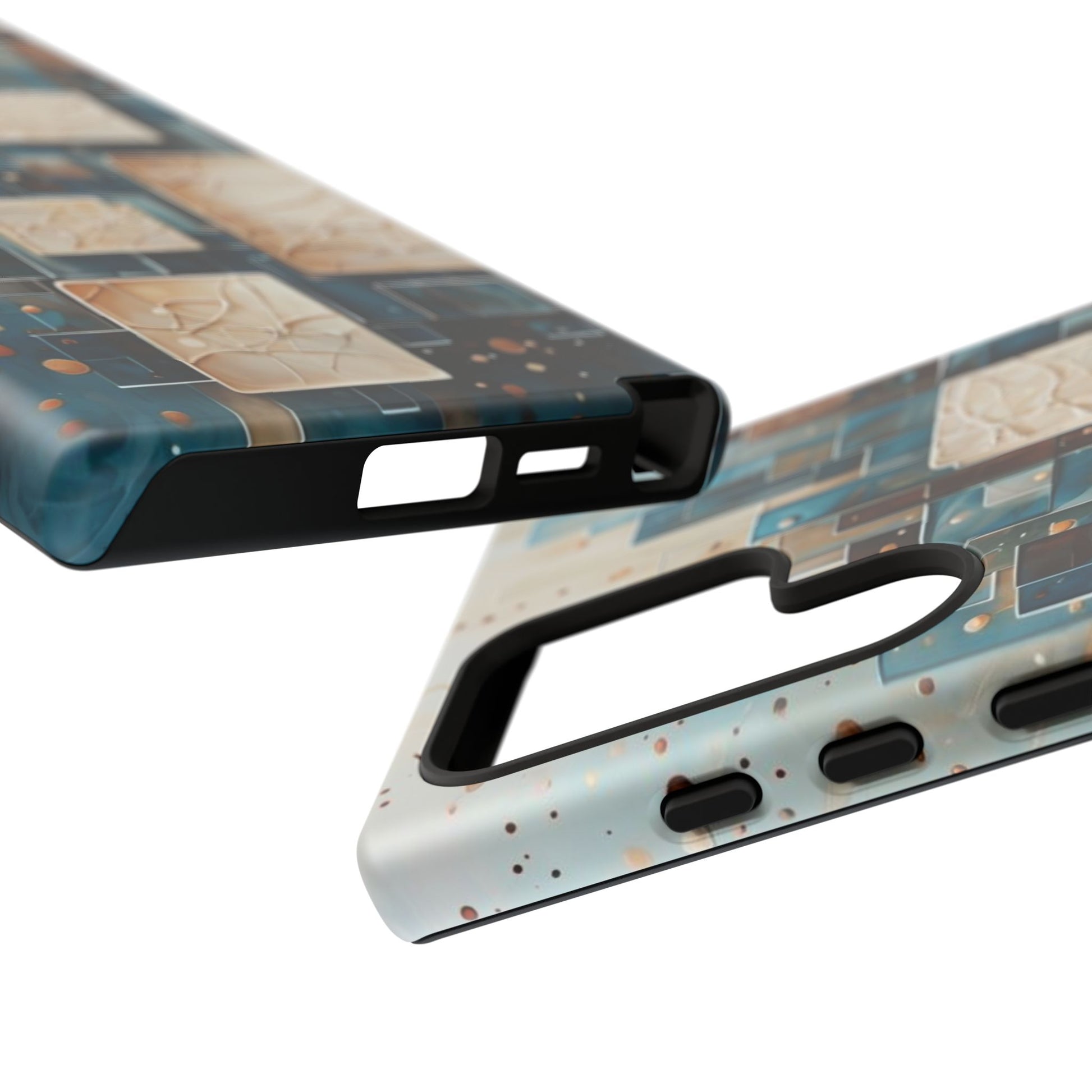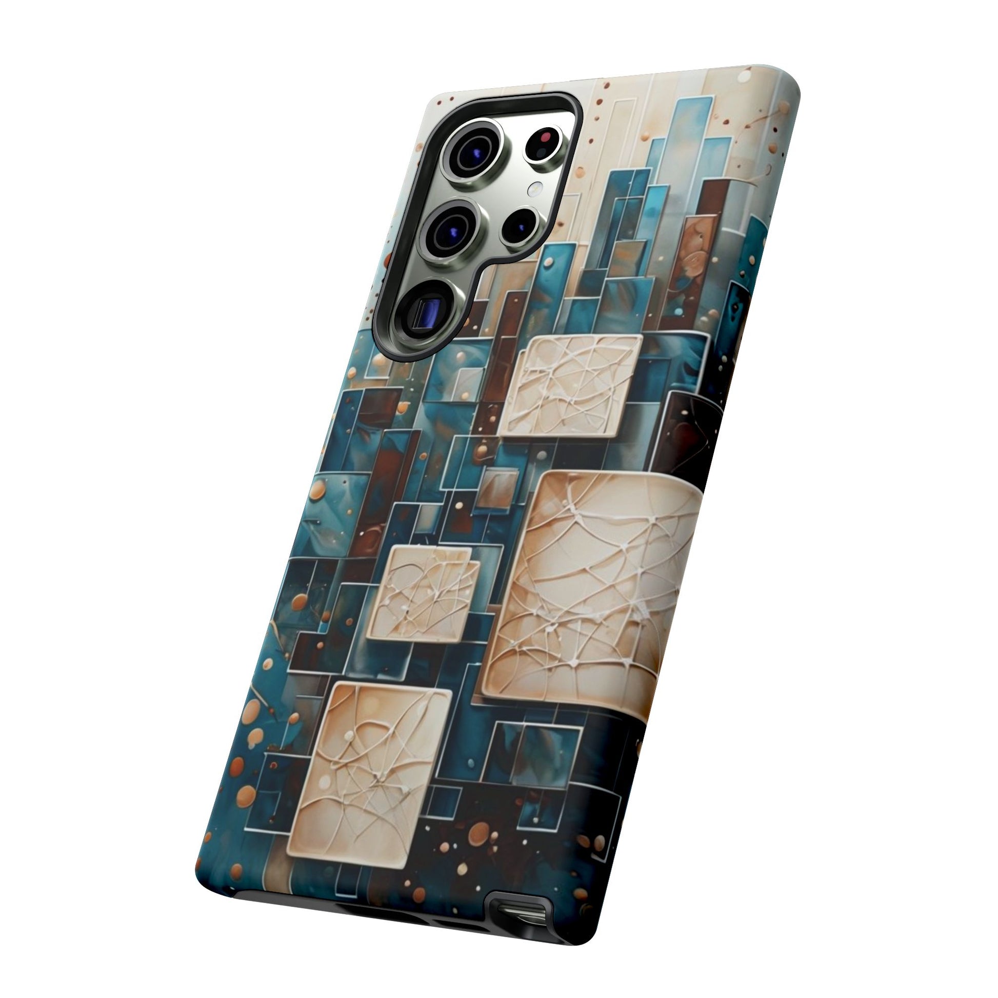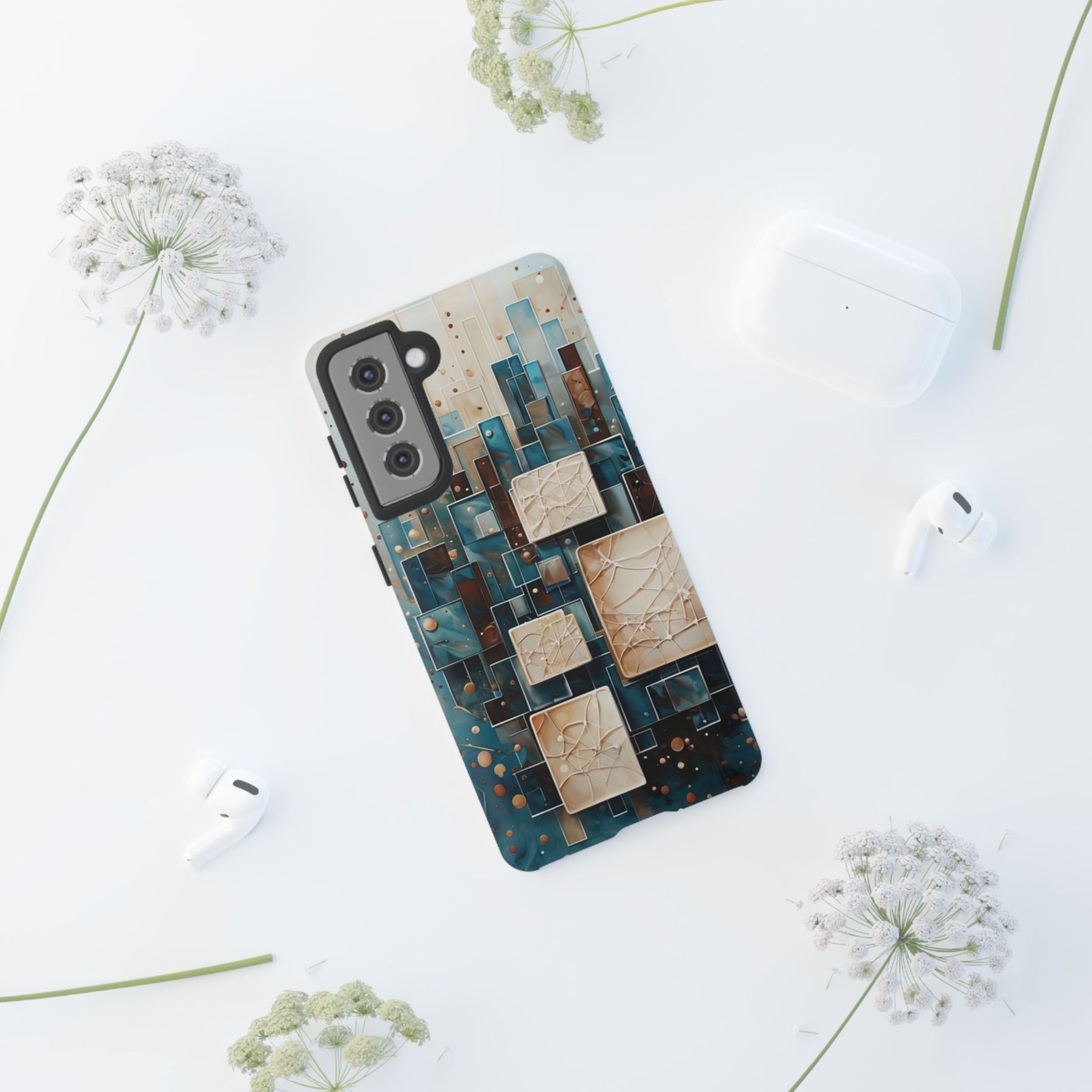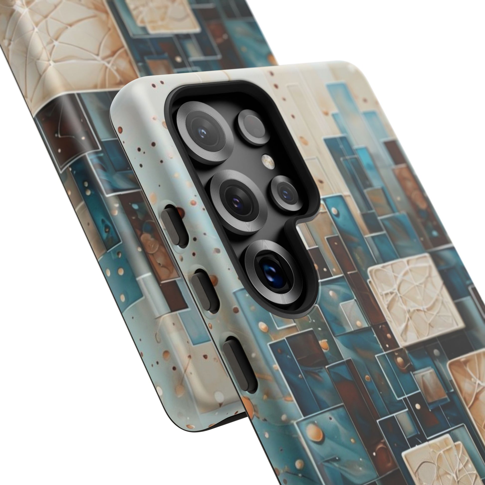 Inspired by modern architecture and layered design, the Architectural Drift Samsung Galaxy Case blends structured geometry with subtle atmospheric detail. Stacked rectangular forms in deep teal, parchment and warm neutral tones create a sense of depth and balance, while delicate dotted accents add texture without overwhelming the design.