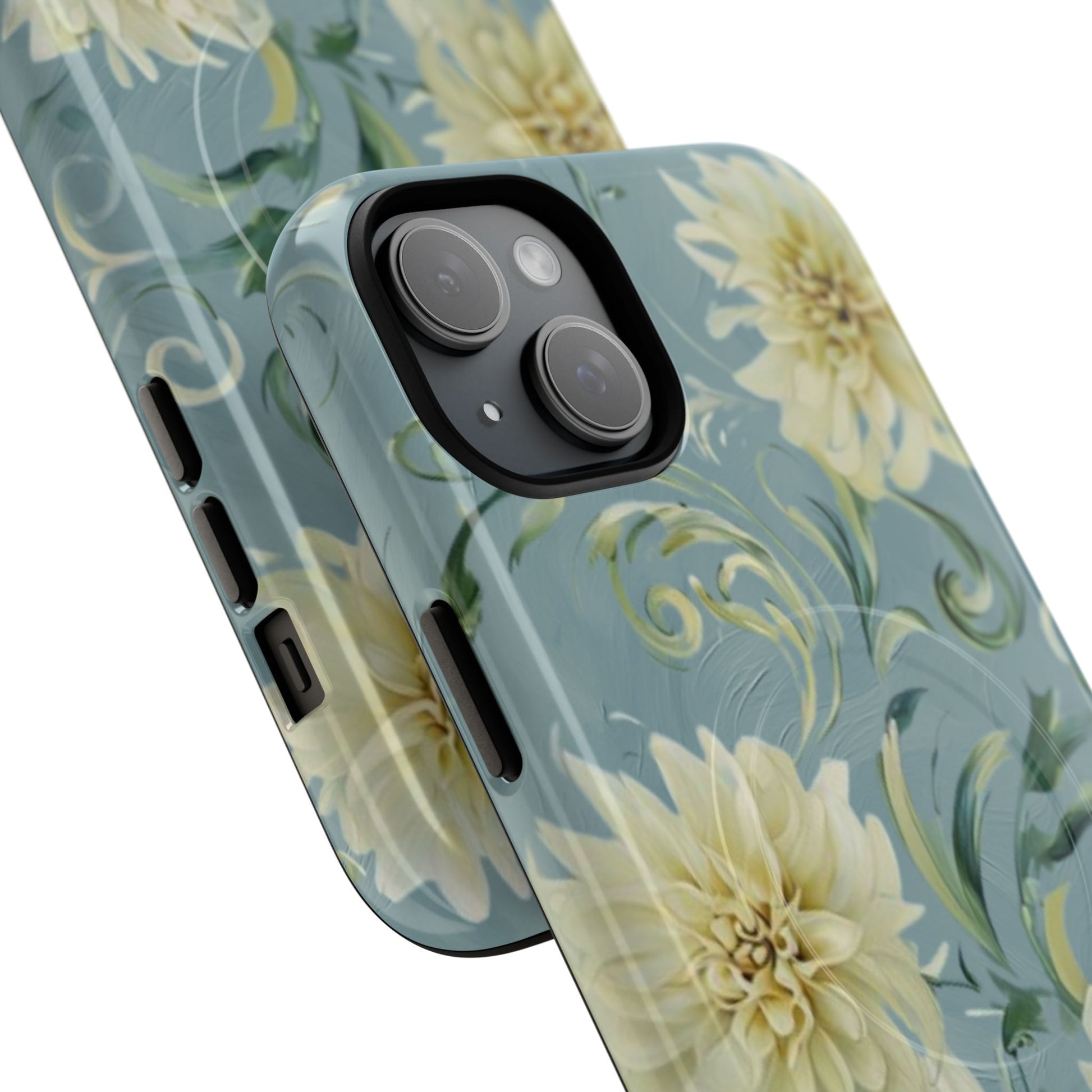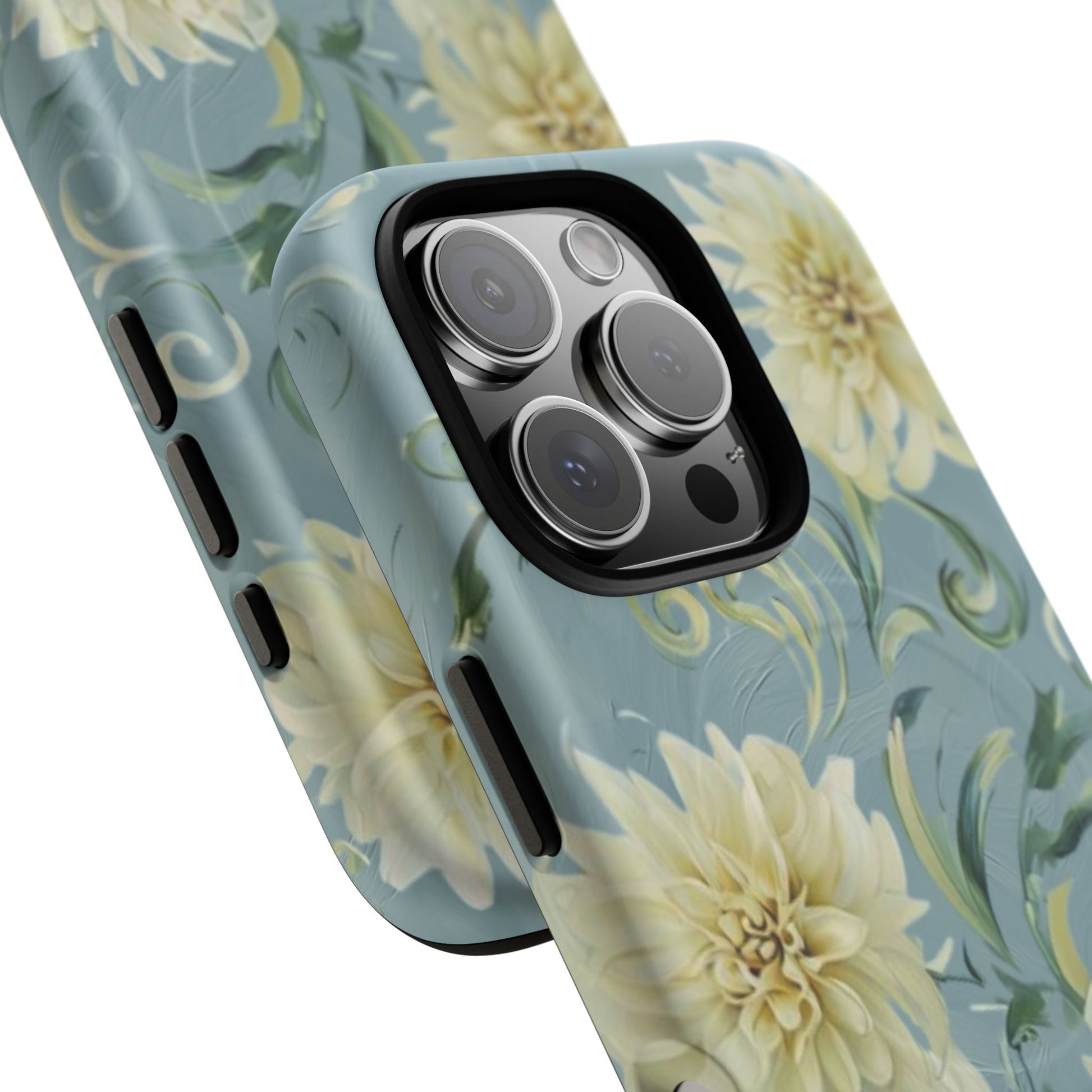 Brighten your device with the timeless elegance of the Golden Dahlia Trio iPhone MagSafe case. Featuring three radiant golden dahlias set against a serene blue background, this case blends classic floral beauty with modern artistry. the painterly design brings a touch of luxury and sophistication to your everyday essentials.