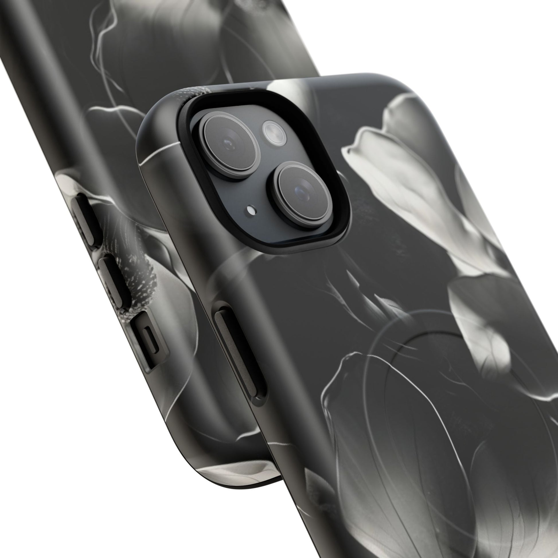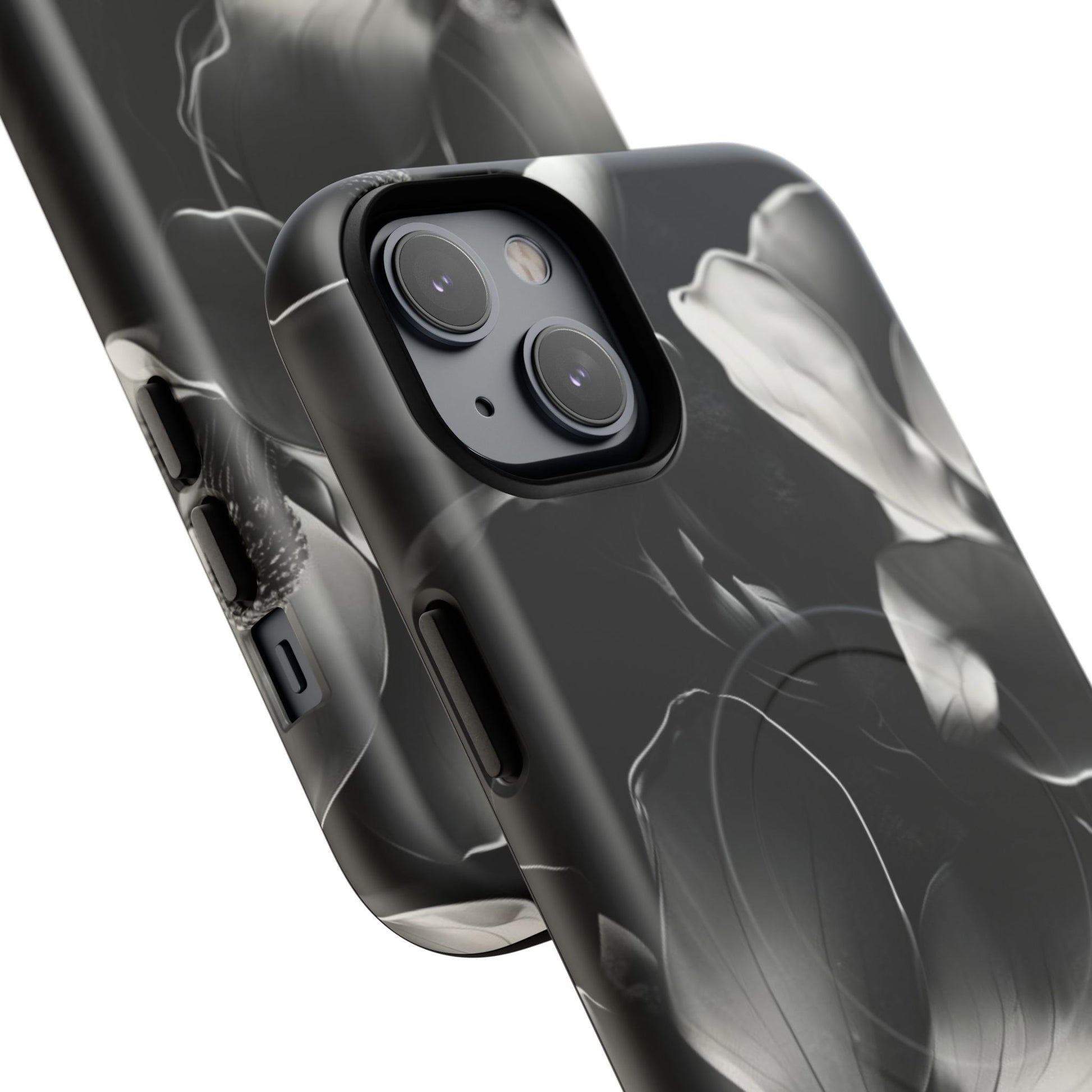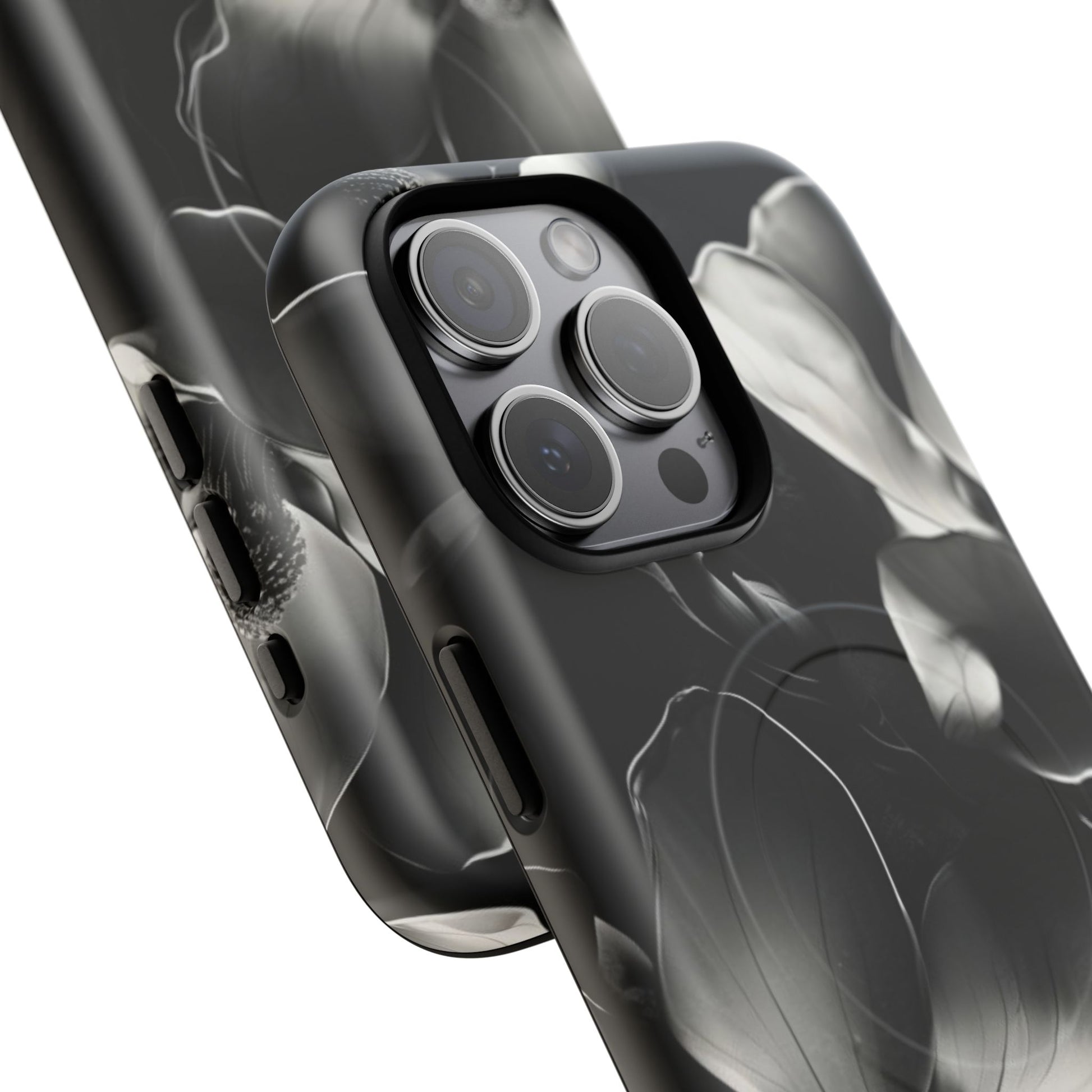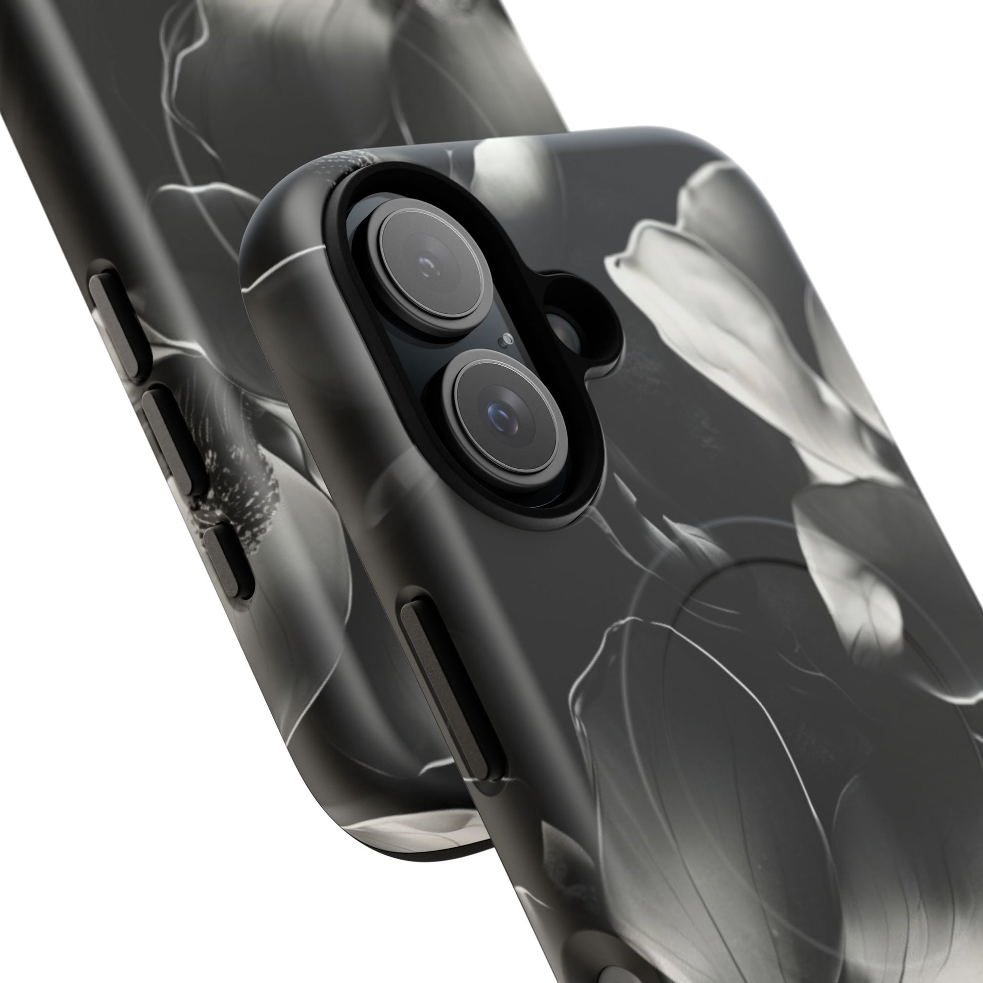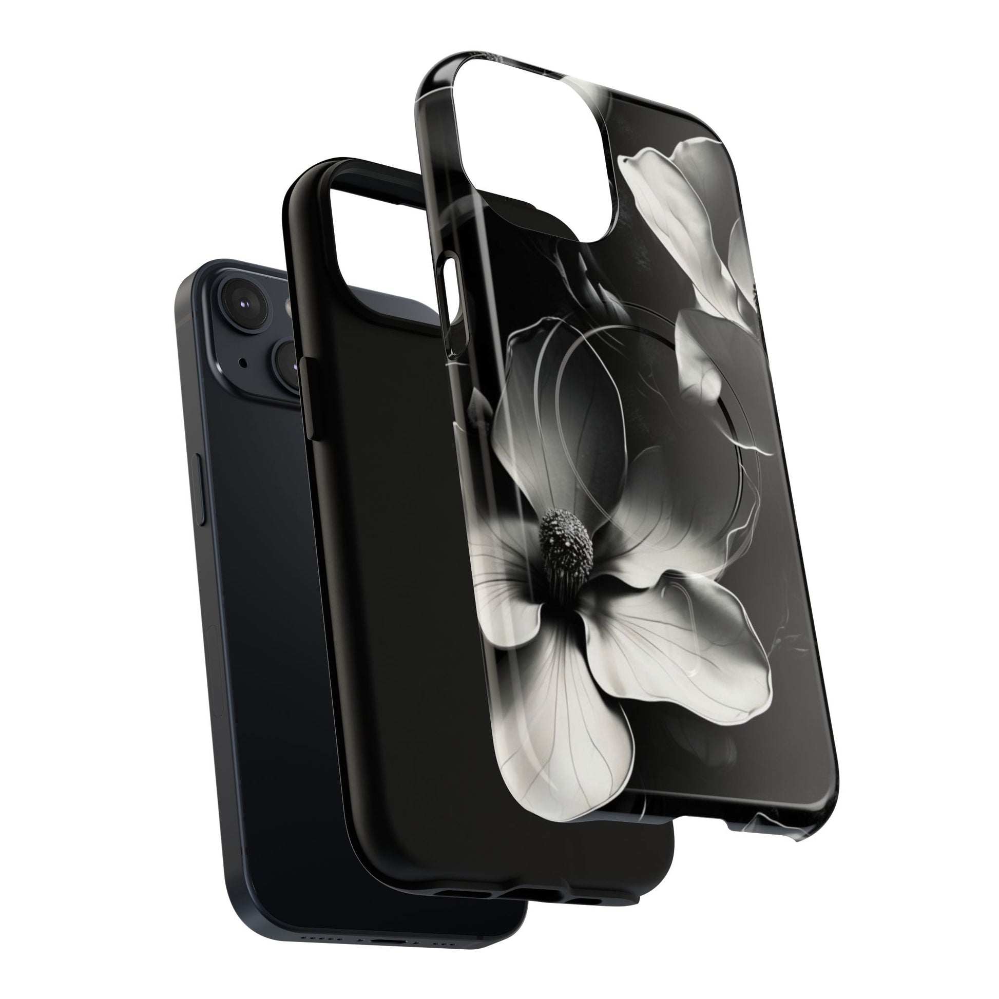 Make a statement with the Monochrome Magnolia iPhone MagSafe compatible phone case. This striking case features bold, black and white magnolias that flow seamlessly into the edges, creating a modern, gallery-inspired accessory for your device. The high-contrast design is both timeless and on-trend, perfect for anyone who wants their phone to stand out with elegance and style.