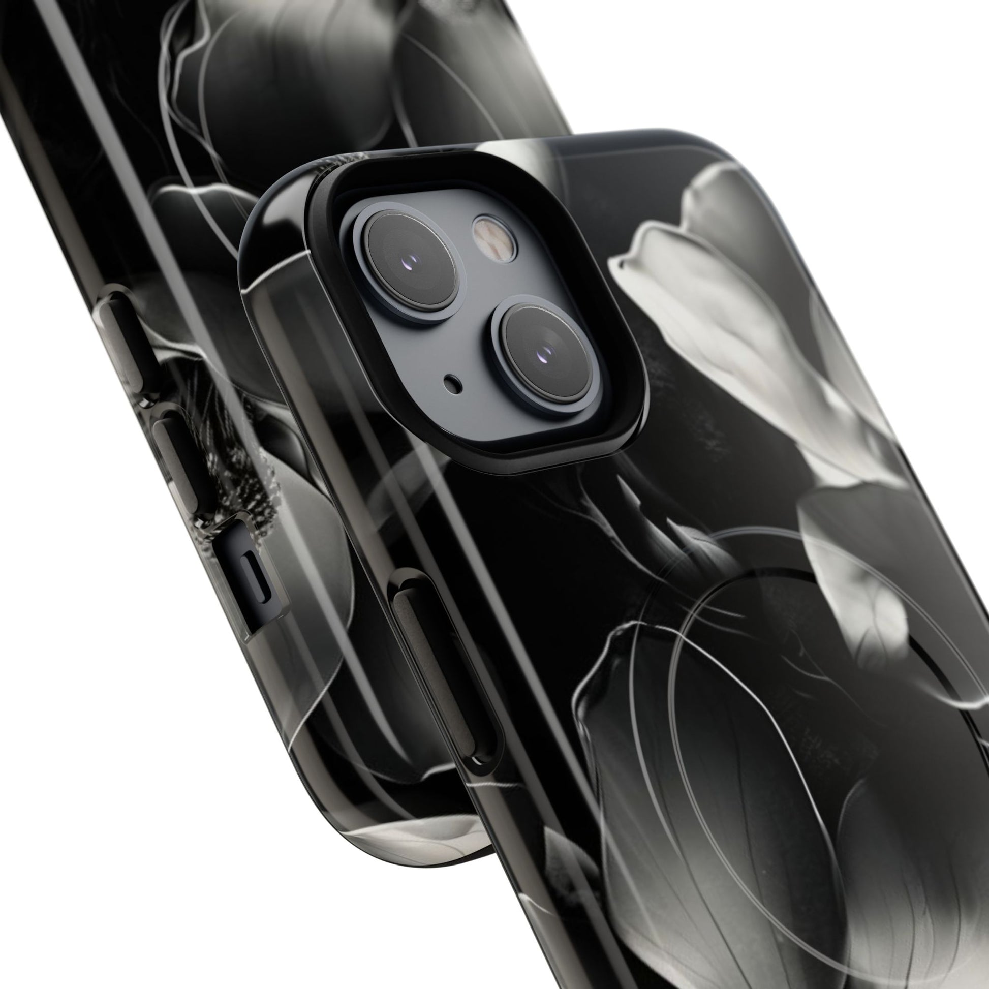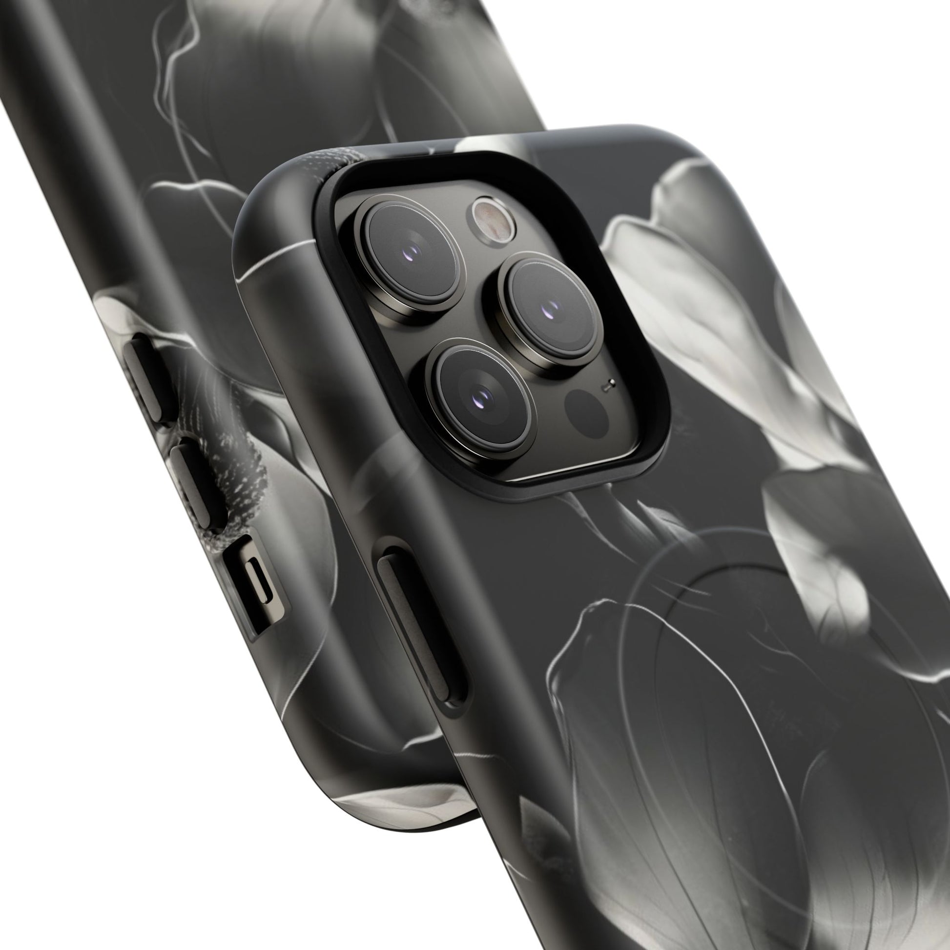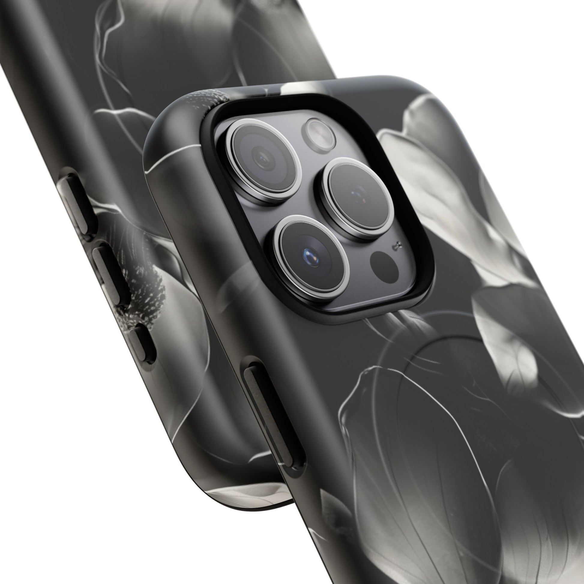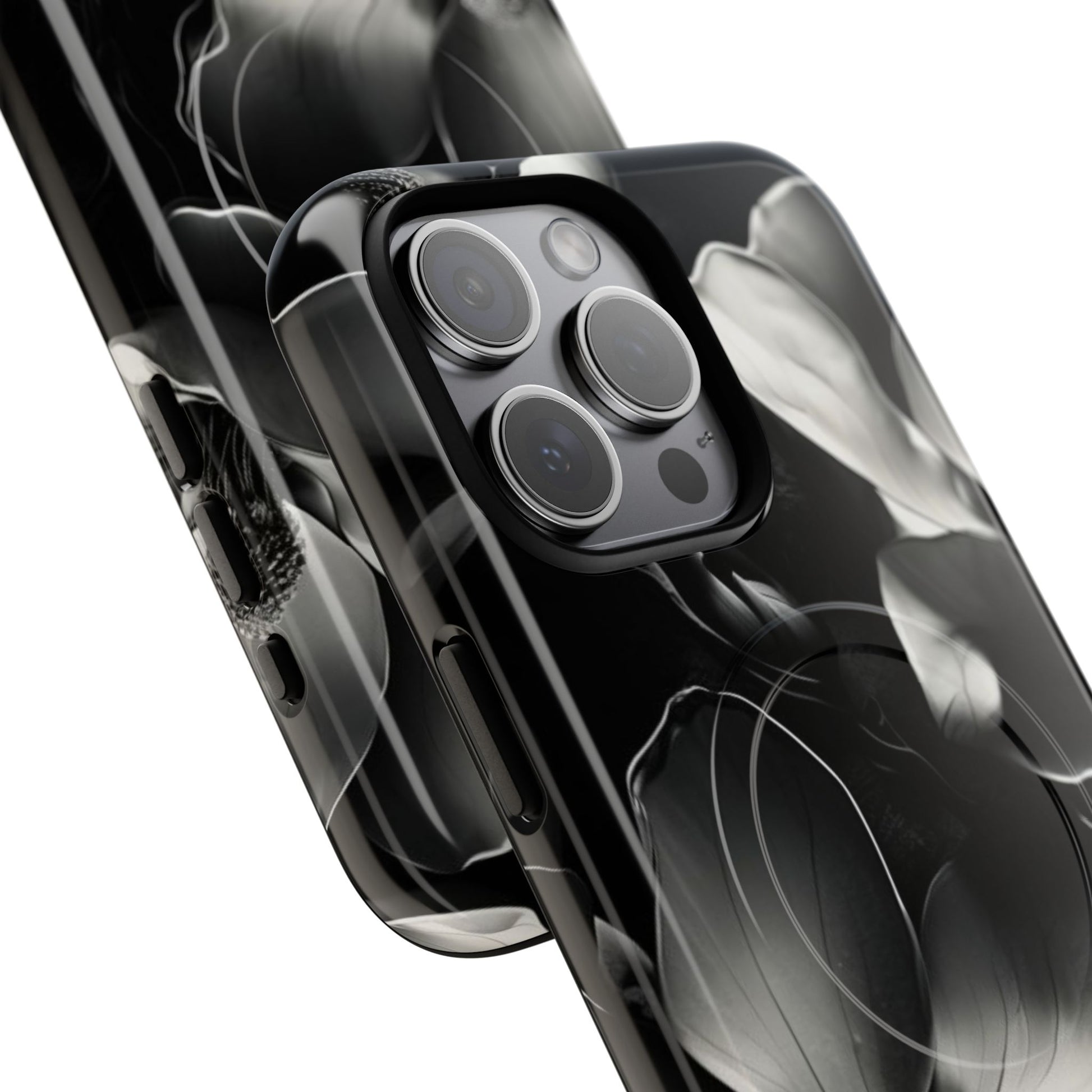 Make a statement with the Monochrome Magnolia iPhone MagSafe compatible phone case. This striking case features bold, black and white magnolias that flow seamlessly into the edges, creating a modern, gallery-inspired accessory for your device. The high-contrast design is both timeless and on-trend, perfect for anyone who wants their phone to stand out with elegance and style.