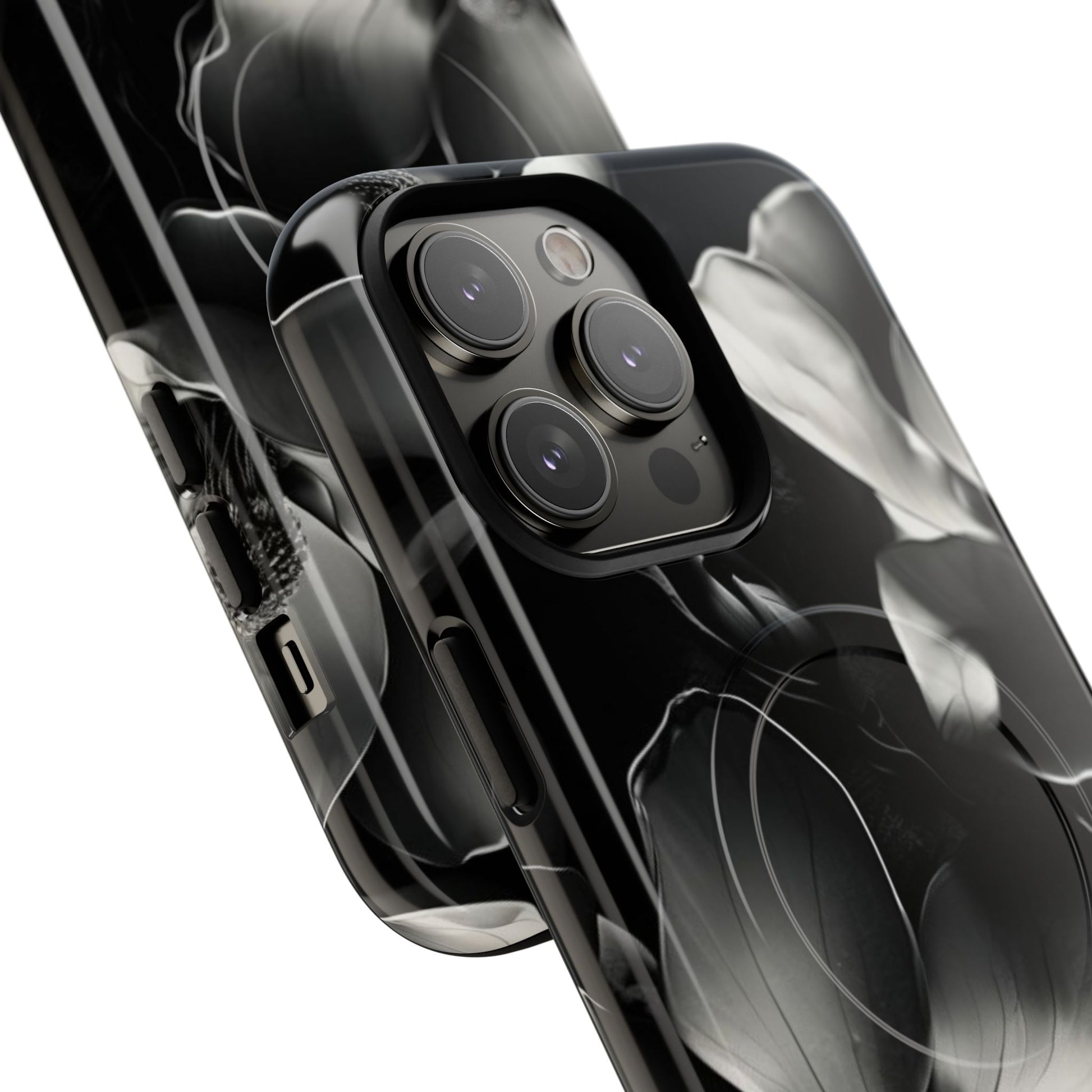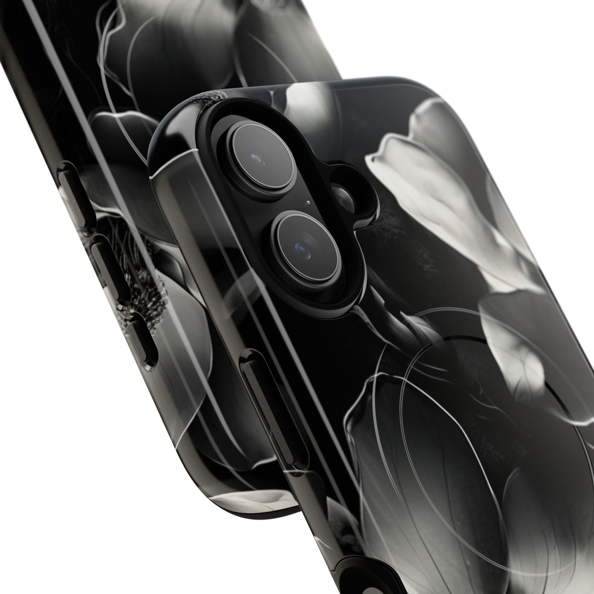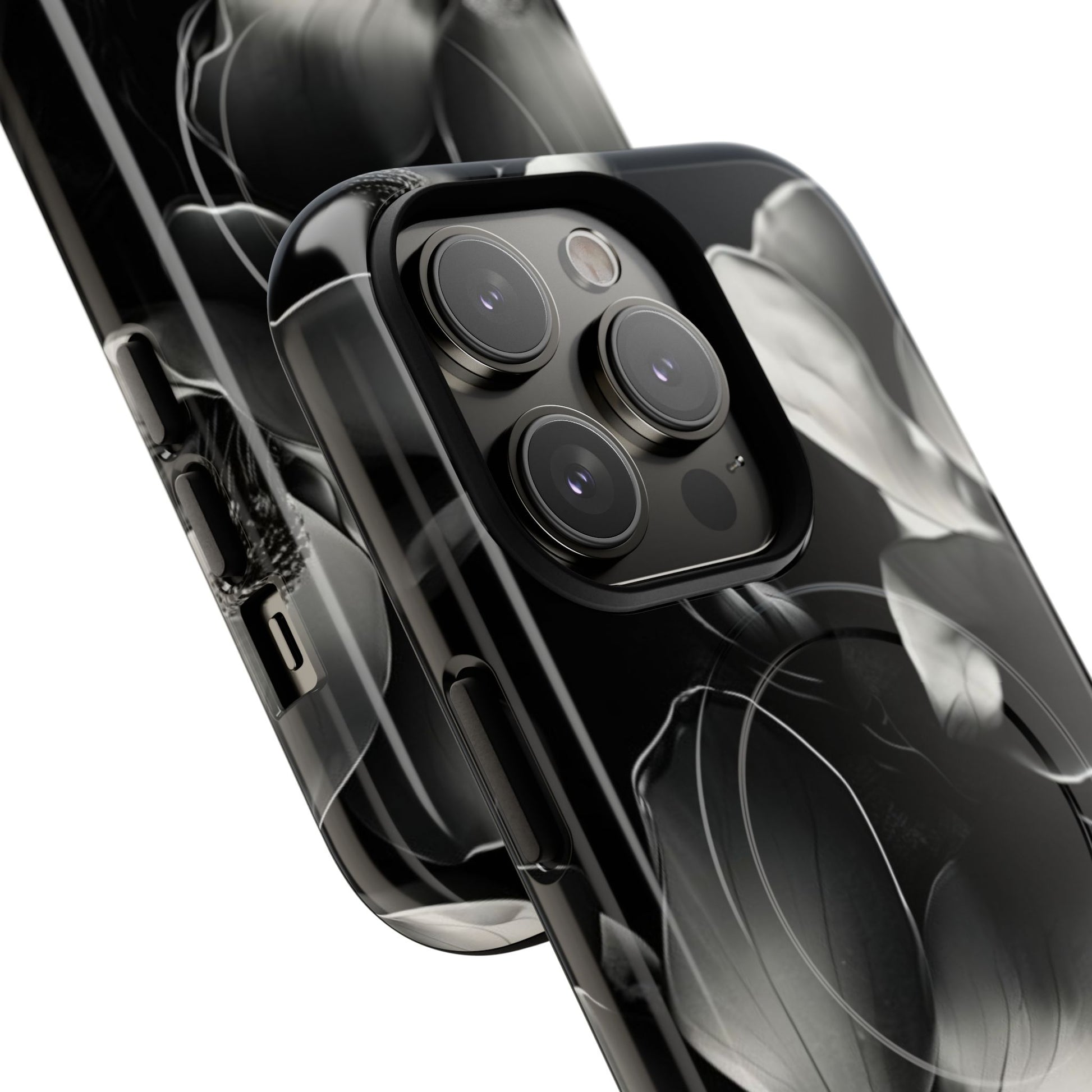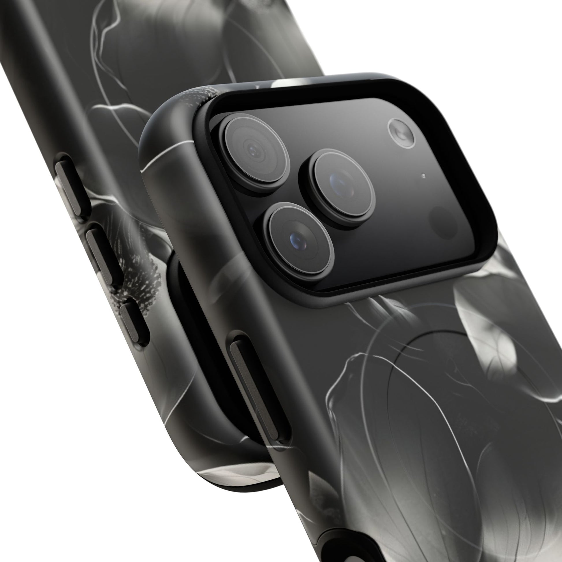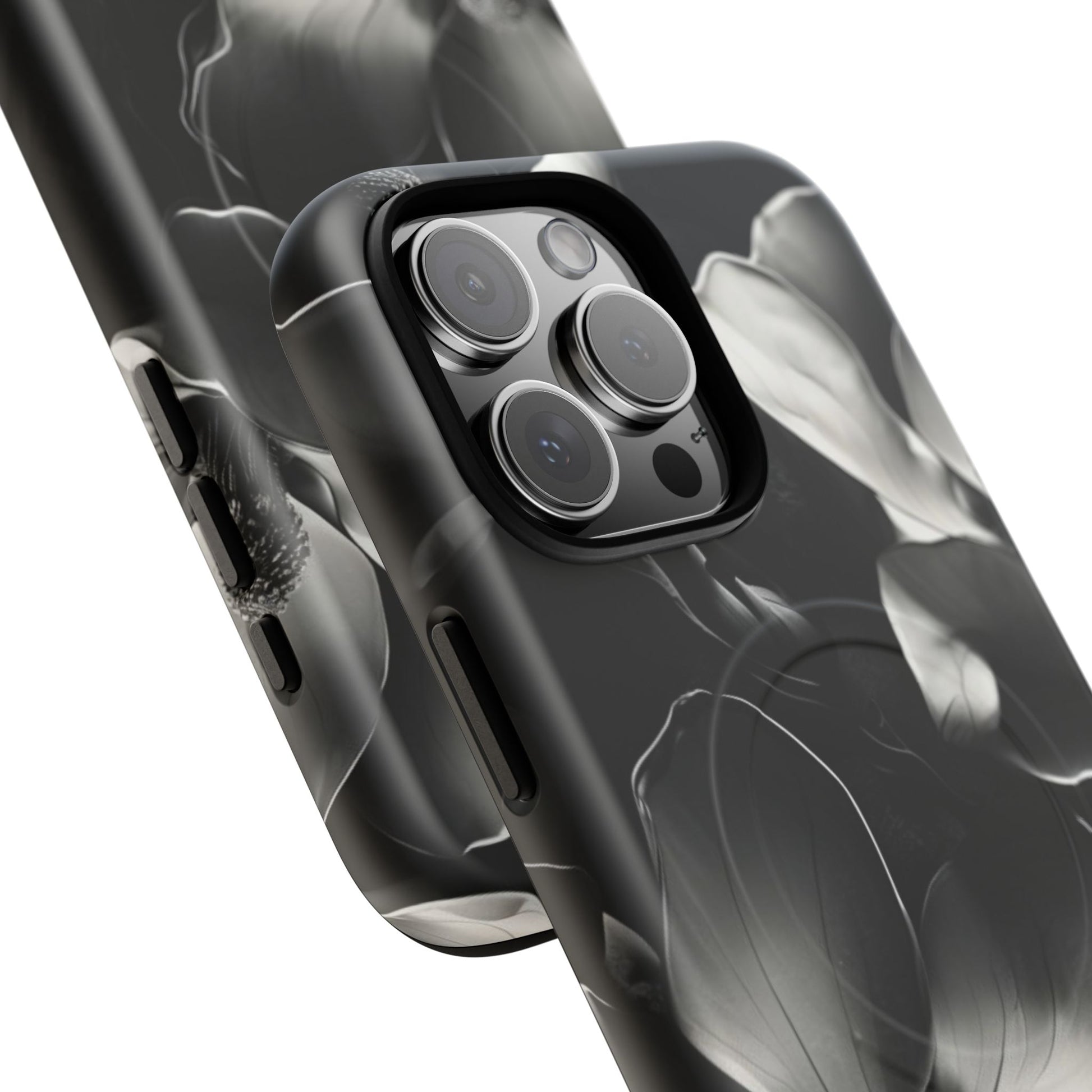 Make a statement with the Monochrome Magnolia iPhone MagSafe compatible phone case. This striking case features bold, black and white magnolias that flow seamlessly into the edges, creating a modern, gallery-inspired accessory for your device. The high-contrast design is both timeless and on-trend, perfect for anyone who wants their phone to stand out with elegance and style.