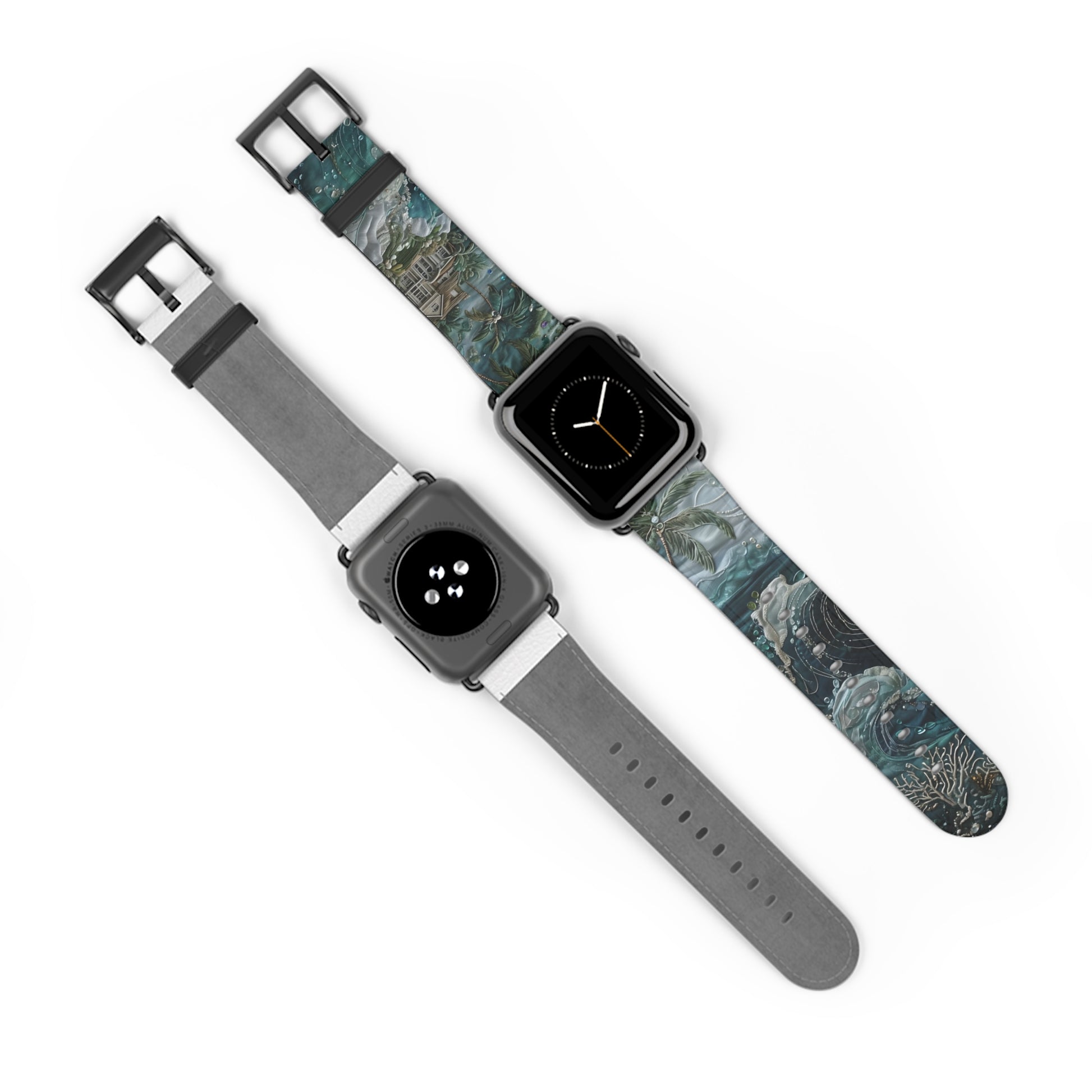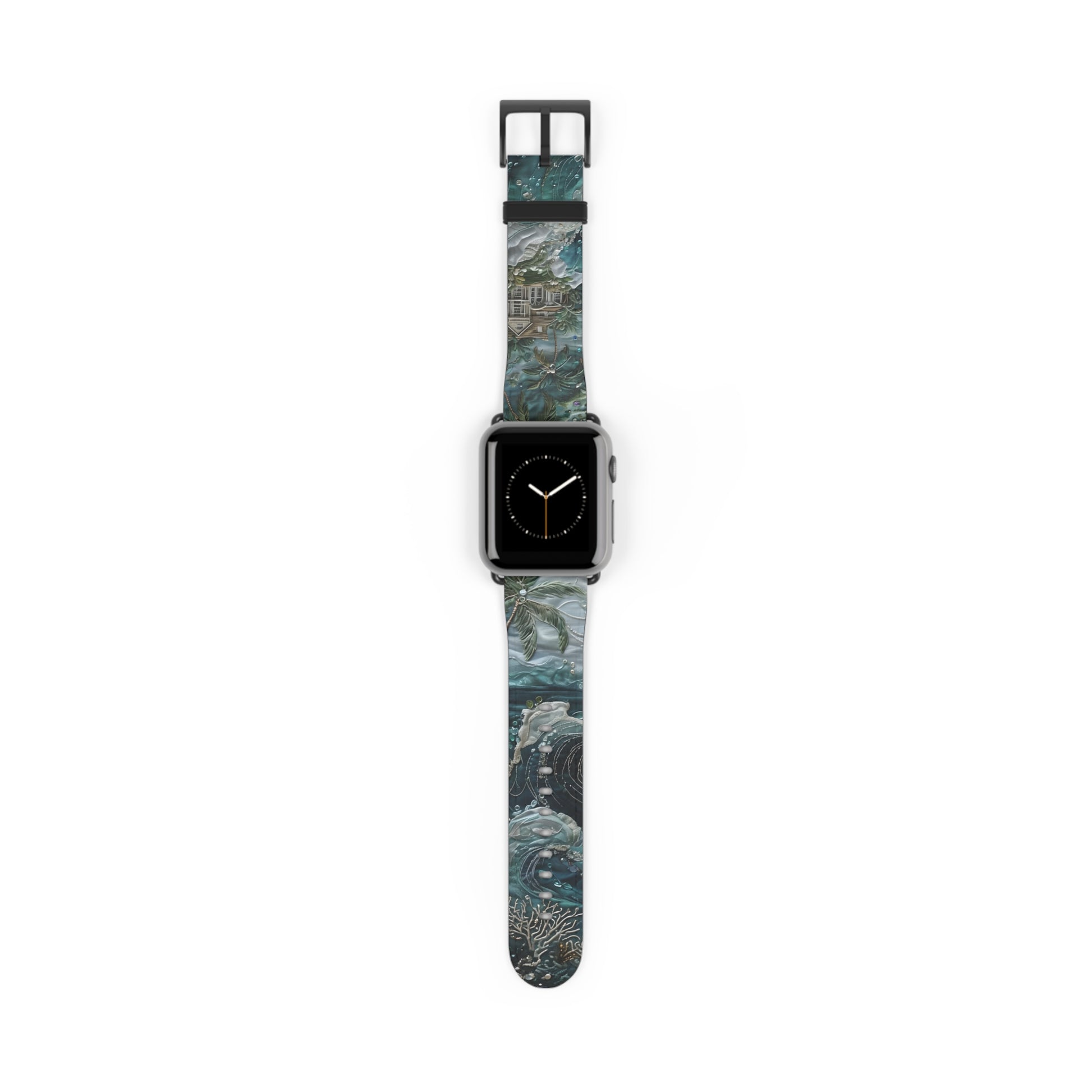 This richly detailed coastal scene features swirling ocean waves, a tropical retreat and intricate bead-like accents rendered in a style that looks beautifully textured but is printed on a smooth, flat surface. A stunning visual illusion that brings depth and drama to any workspace or room. Designed for both style and protection, it is perfect for students, professionals, and anyone who loves unique design. The high-quality, animal-friendly material offers a luxurious feel, while the stainless steel hardware ensures lasting strength and a secure fit. Whether you're at the office, the gym, or out for the evening, this band elevates your look with a touch of modern artistry.