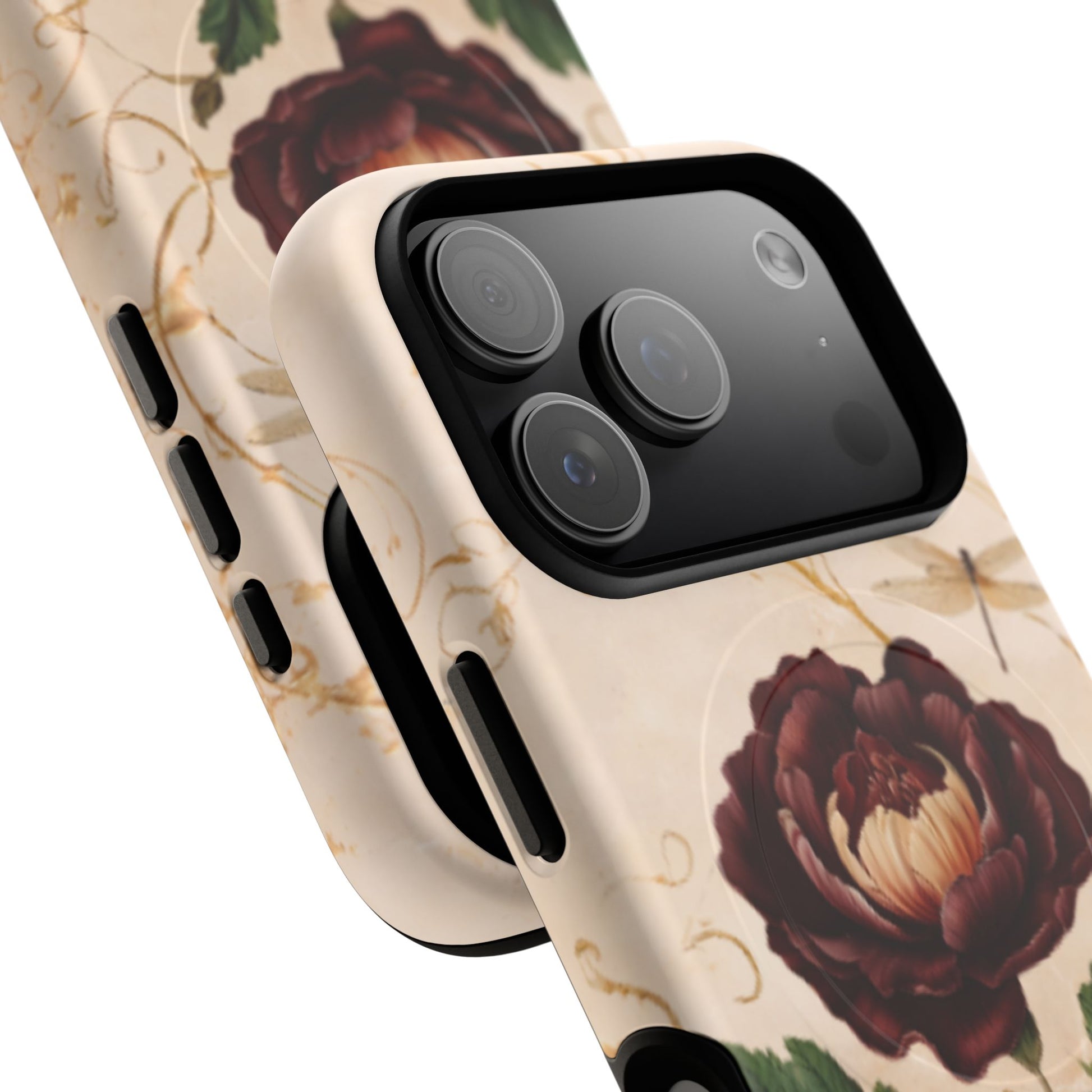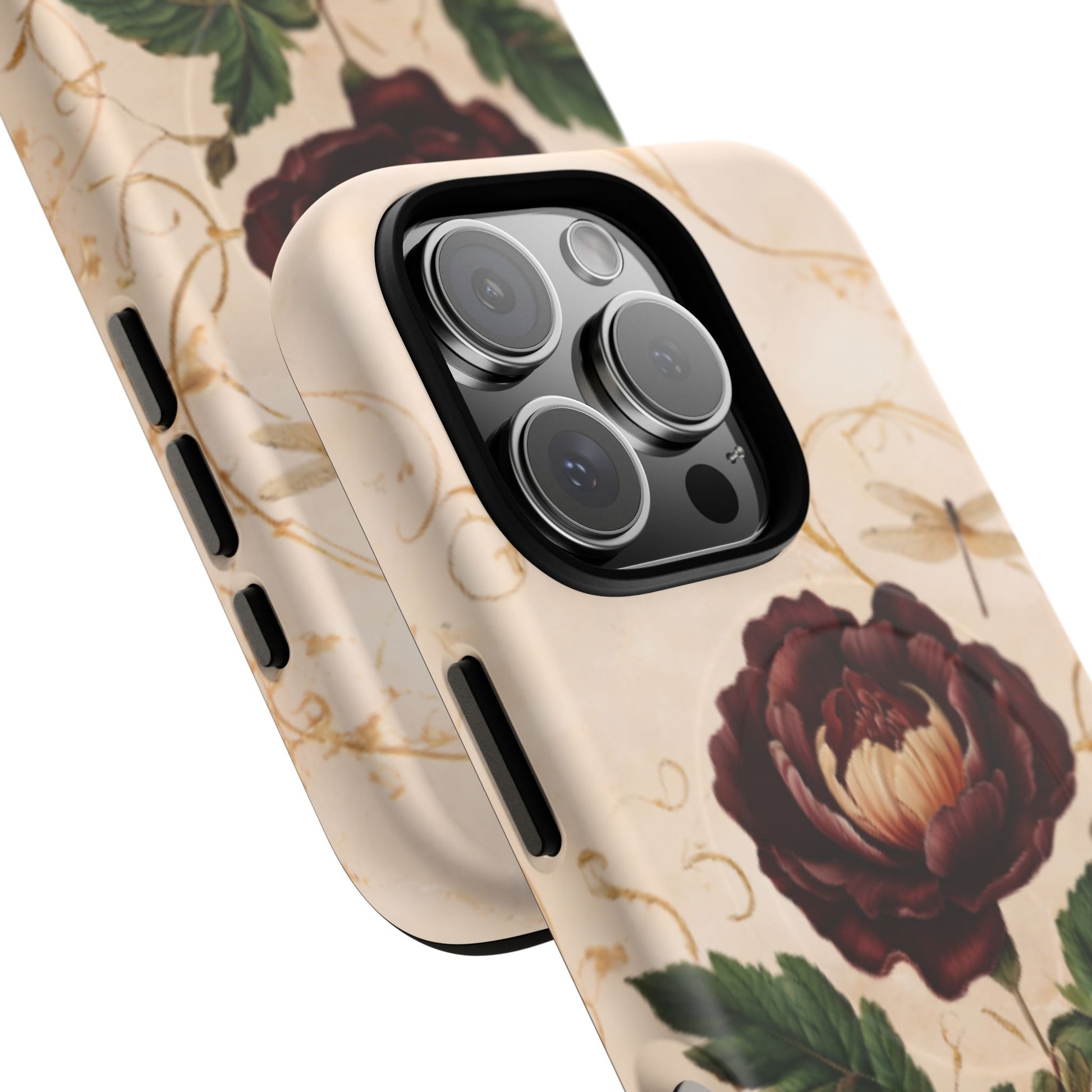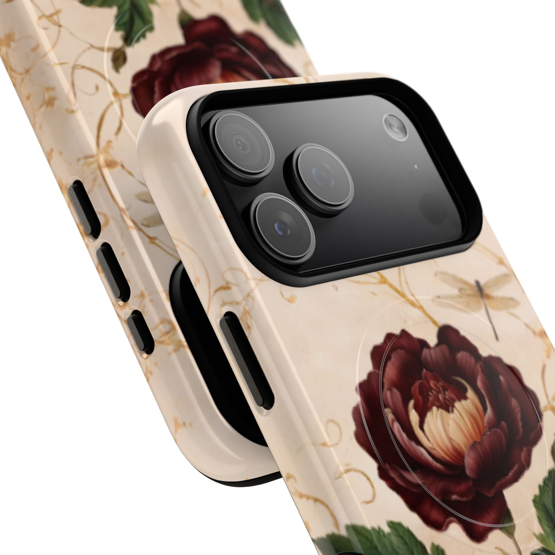 Add a touch of timeless romance to your iPhone with the MagSafe Vintage Burgundy Rose phone case. Featuring lush, painterly burgundy roses and soft green foliage on a creamy background, this case is the perfect blend of classic elegance and modern protection.